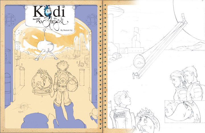 This is the intro spread with a concept gallery on the left and the bio and story establisher on the right. Then they would go straight into the story well prepared (following spread). I am finished with the line work of the 8 pages and have now started the digital painting as you can see with page 1 on the left side of the second spread.